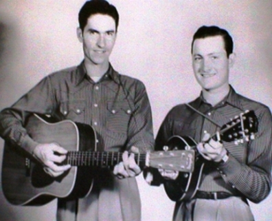 When Jim & Jesse were learning to play and sing, the brother duet acts in country music were extremely popular. They listened to the radio shows and bought 78 rpm records of such pioneers as the Delmore Brothers, the Monroe Brothers, and the Blue Sky Boys, and sought to emulate their styles. With Jesse plauing mandolin and singing lead and Jim providing the tenor harmony and guitar accompaniment, the two brothers came up with a vocal blend that was uniquely their own. Jim & Jesse in 1947